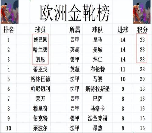 欧洲金靴榜最新战报姆巴佩凯恩哈兰德第1意甲无人进前十