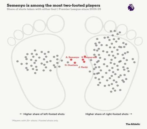 由于他的双脚均衡能力,对手的防守变得更加复杂。如果我们观察自2024-25赛季以来球员的射门脚分布,塞门约可能是联赛中最“双足皆能”的球员。