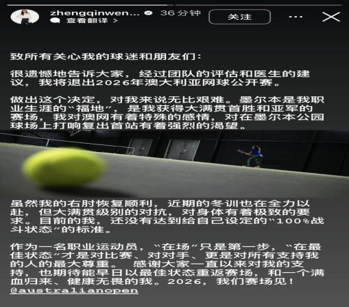 郑钦文宣布退出2026年澳大利亚网球公开赛 界面新闻 2026-01-10 15:59:07 今天(1月8日)下午,郑钦文在个人社交平台上宣布,经过团队评估和医生建议,她将退出2026年澳大利亚网球公开赛。 上一篇: 郑钦文宣布退出澳网:我还没有达到100%战斗状态的标准下一篇: 郑钦文退出澳网!